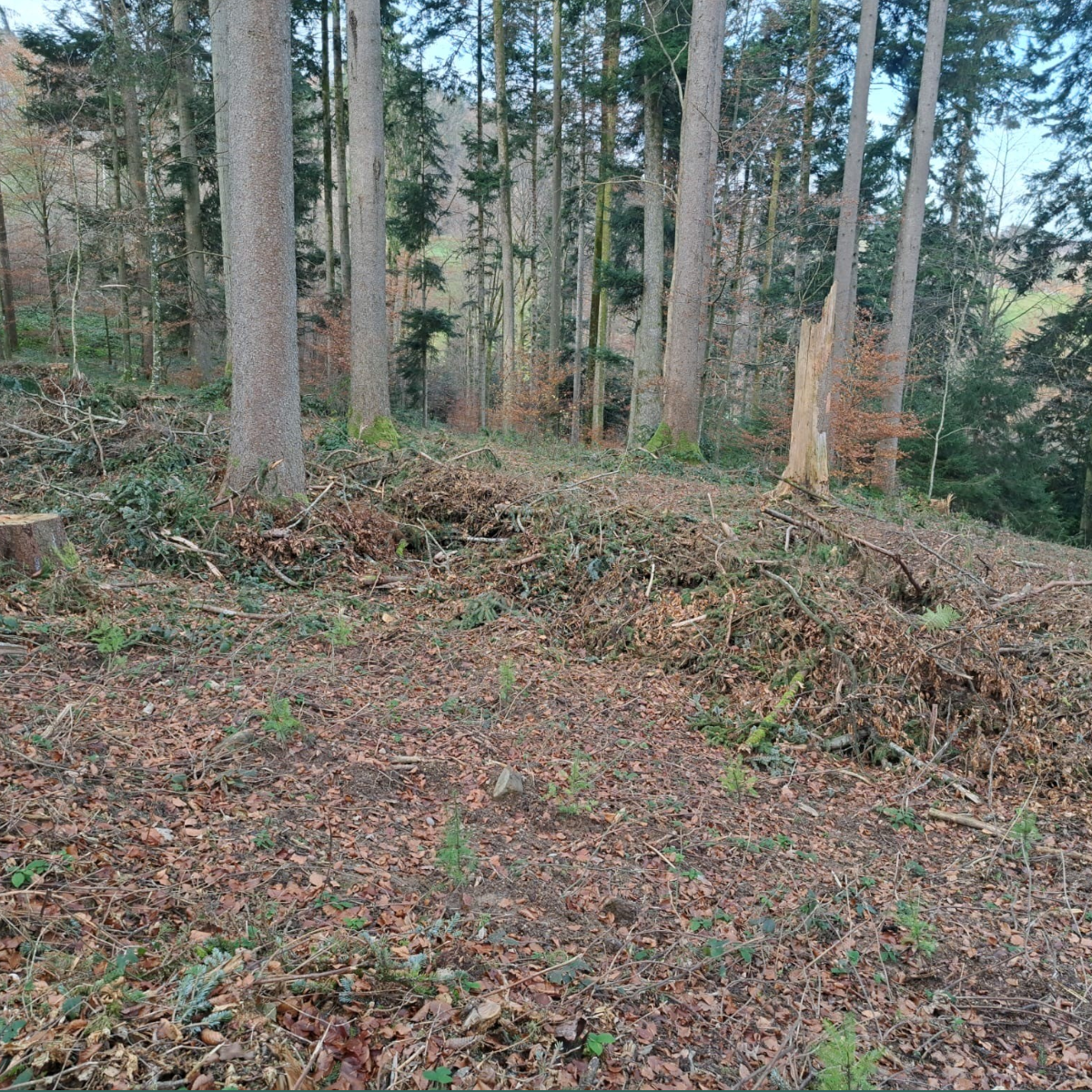 Im steilen, schwer zugänglichen Gelände wurde eine Fichten-Monokultur entfernt, wodurch eine Kahlfläche entstanden ist. Diese Fläche stellt eine bedeutende Herausforderung für die natürliche Waldverjüngung dar. Der hohe Konkurrenzdruck durch die Begleitvegetation schränkt die Möglichkeiten einer Regeneration stark ein. Um dem entgegenzuwirken und die Biodiversität im angrenzenden Waldgebiet zu fördern, sind gezielte Massnahmen erforderlich.